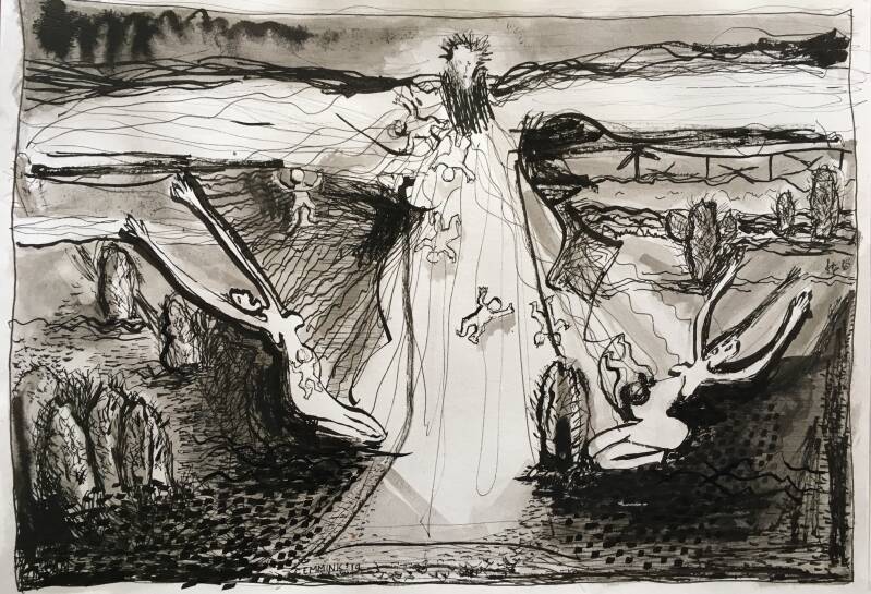 Dat geldt ook voor dit werk van Carla Emmink uit Utrecht. De titel is ‘Op zoek naar de Plaats’. Er valt veel te associëren op deze inkttekening met donkere ondertoon. Kerk- en schoolgebouw zijn de zichtbare plaatsen van samenkomst waarin protestantse christenen hun geloof belijden en hun cultuur praktiseren. Keurige rijen gelovigen en grazige weiden wisselen elkaar af met over elkaar buitelende figuren, waarin je gezinnen kunt ontwaren, kerkleiders en blote vrouwen.